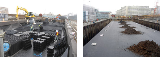 アクアロードは、近年多発するゲリラ豪雨による、道路の冠水対策として開発された樹脂製帯水材です。冠水現場に近い道路下空間を有効に利用して、安心して暮らせる都市環境つくりに役立ちます。