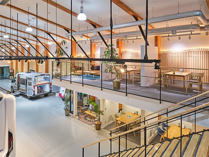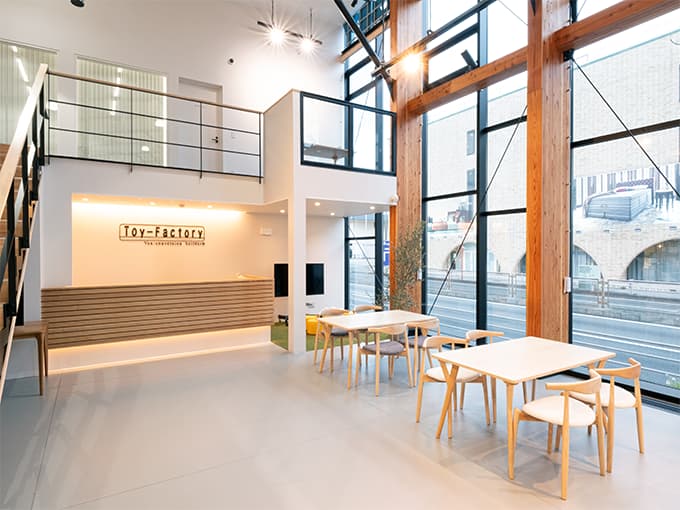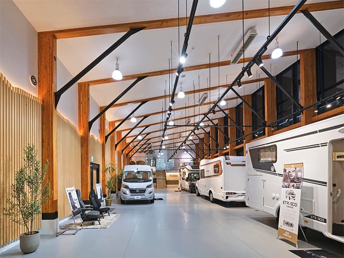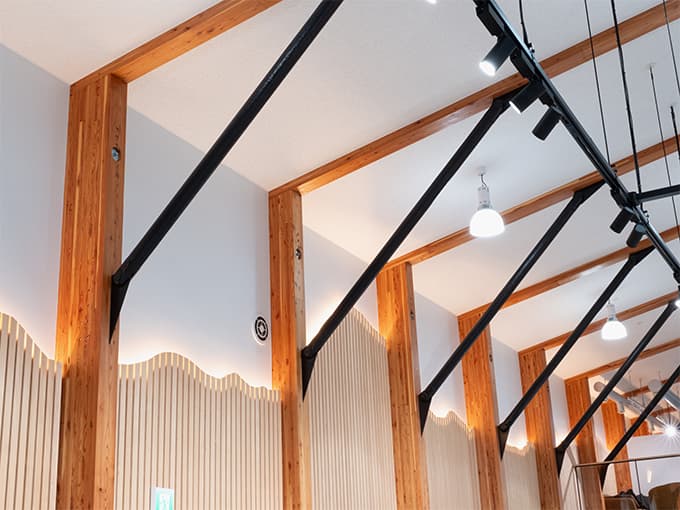 画一的な鉄骨造になりがちな大空間の店舗・倉庫・工場においても山形トラス、片流れトラス、水平トラスなどデザインの幅が広がり、木造ならではの温かみのある空間も実現可能です。