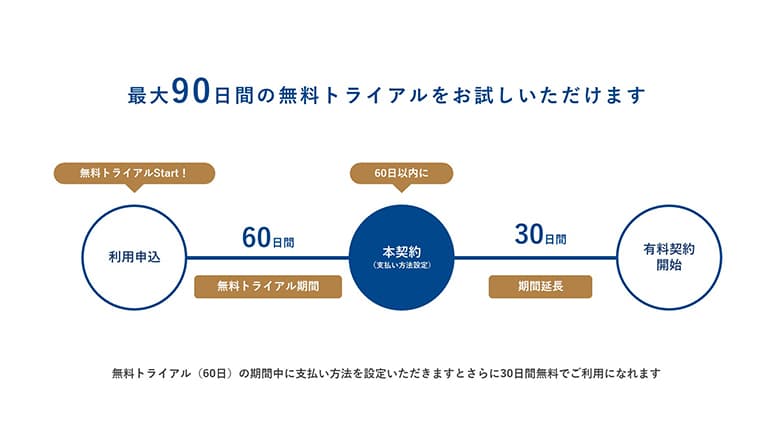 無料トライアル60日の期間中にお申込みいただくと、さらに30日間無料でご利用になれますご興味のあるお客さまは、弊社の営業担当またはフォームよりお問い合わせください。