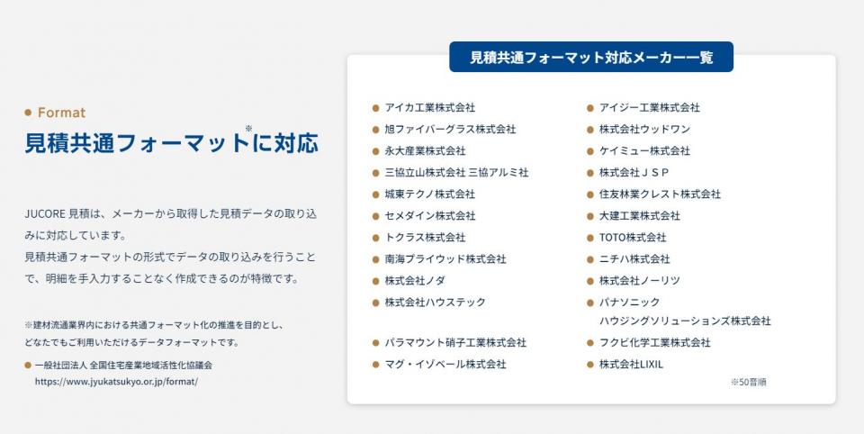※ 建材流通業界内における共通フォーマット化の推進を目的とし、メーカー、建材流通事業者等が自由に利用できるデータフォーマット。(https://www.jyukatsukyo.or.jp/format/)