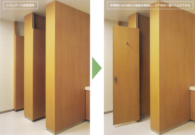 トイレブースは通常使用の平常時には安全・安心のために外側から開錠できないのが絶対条件です。また非常時には外側から簡単操作で素早く開けられることが、安全・安心な利用につながる大切な条件です。「ライフテクト」は、平常時と非常時の二つの安全・安心を同時に実現するトイレブースです。