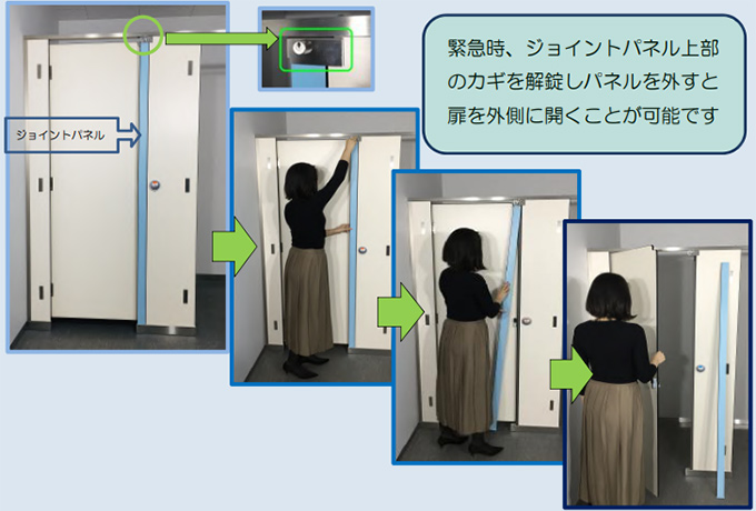 緊急時、ジョイントパネル上部のカギを解錠しパネルを外すと扉を外側に開くことが可能です。