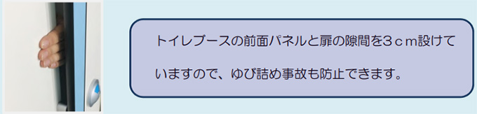 トイレブースの前面パネルと扉の隙間を3㎝設けていますので、ゆび詰め事故も防止できます。