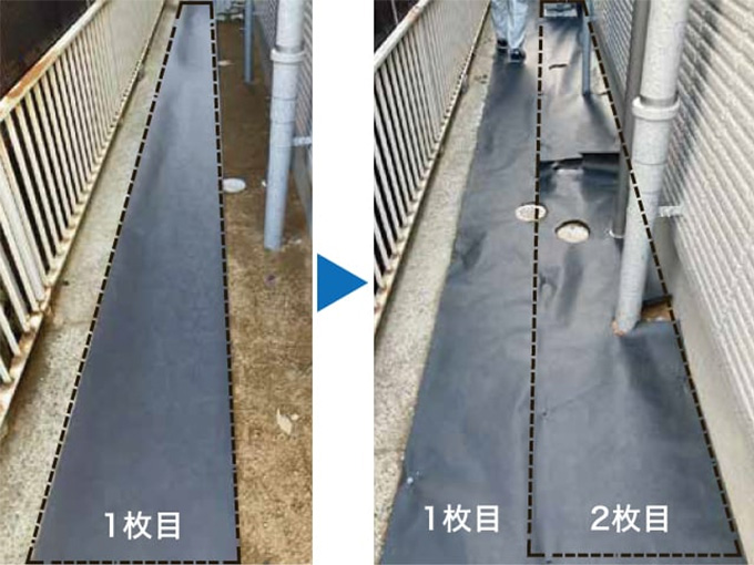 2. 2枚目は幅に合わせて設置するだけですき間がなくなります。重ね部分には砂利下用接続テープが便利です。
