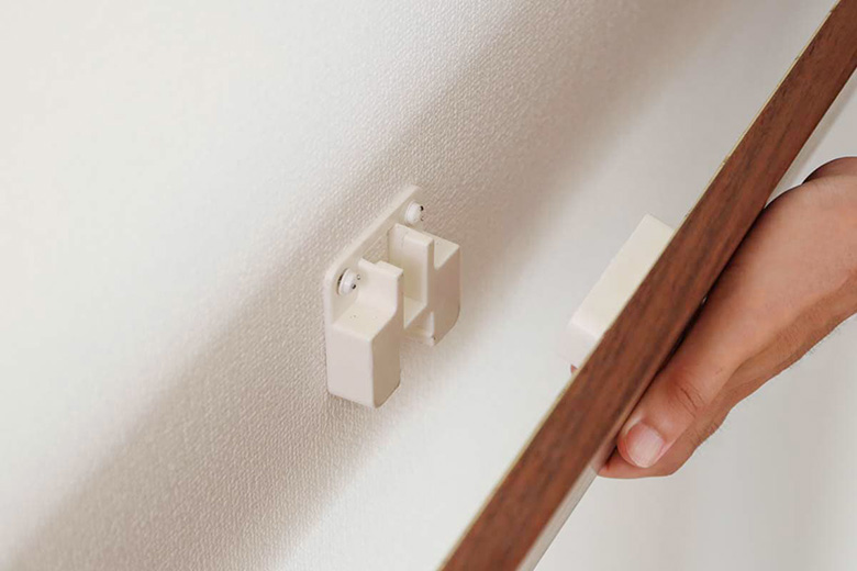 石膏ボードには虫ピンで、木壁にはネジ止めも可能で。