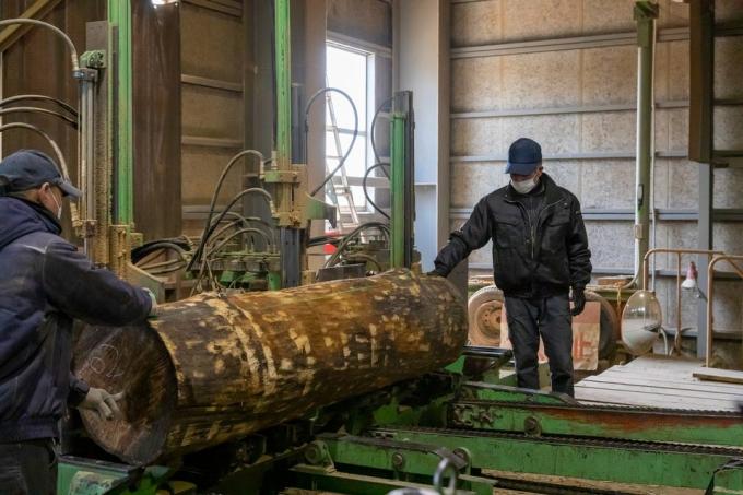 広葉樹は、成長が盛んな春から夏に伐採すると、その分傷みが早くなるため、葉が落ちて成長が止まる秋から冬の間だけが伐採期間。1年分の材料の買い付けはこの間に行われるため、原木を大量に保管するスペースが必要です。