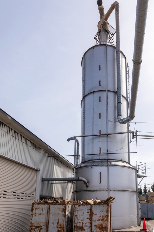 ▲木材の乾燥や工場の暖房に使われているのは、木くずなどを燃料とするボイラーの熱です。廃棄物になるはずの端材の有効活用はSDGsにも通じています。