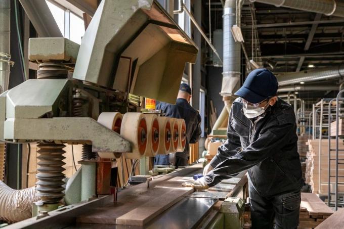 加工工場で行われているのは、木材を貼り合わせて作る集成材や、取引先からのオーダーに沿った加工、住宅資材や造作家具づくりまで実にさまざま。並んでいる木材の色や木目に、広葉樹が持つ表情の豊かさが感じられます。