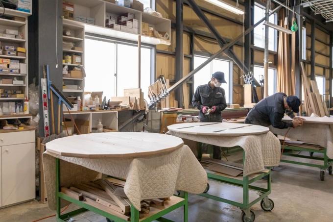 これらの原木は、切り出しと用途に合わせた切り分け・加工~屋外の製材ヤードで「天然乾燥」~温度湿度管理による仕上げの「人工乾燥」の工程を経て製品となります。原木を切り出してから乾燥するまで約1年半から2年の歳月をかけて、ようやく家具材として使われる製品が完成するのです。