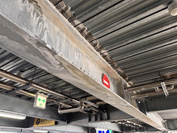 豪雪地帯にあるため、駐車中の車のタイヤに付着した融雪剤の影響で、駐車場のコンクリートが劣化。さらに、デッキ裏には多数の錆が発生していました。