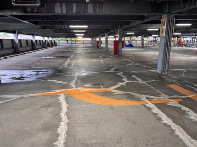 長年の融雪剤の影響により、駐車場のコンクリートが劣化し、デッキ部分には錆が発生。来院者の車両や建物の維持管理にも影響が出始めており、お困りの状況でした。