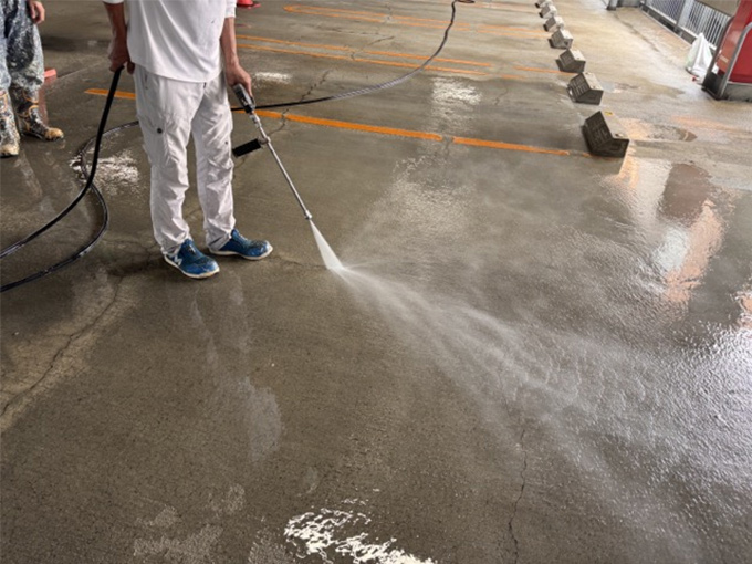 その後、床面全体にシリカテックを散布し、余剰分は散水洗浄によって除去。