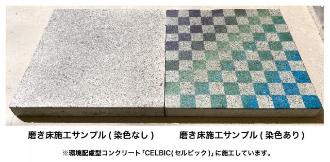 一般的なコンクリートと同様に、環境配慮型コンクリートについても磨き床施工を行うことが可能です。専用の染料による色付けにも影響がなく、写真のように床面の一部に模様を描くこともできます。