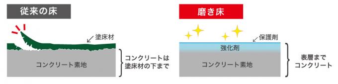 磨き床は、素地となるコンクリートを磨き上げて床面にする工法です。磨かれた床面は照明を反射し、空間を明るく演出します。また、床面の剥がれや摩耗による劣化が少なく、清掃しやすい床になる点も特徴です。さらに、施工過程で専用の染料を用いた染色を行うことで、床面に色をつけることもできます。これにより、床面の一部にロゴを描いたり、床面全体をアート作品にしたりすることが可能です。