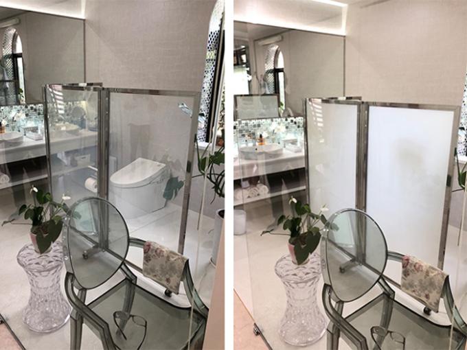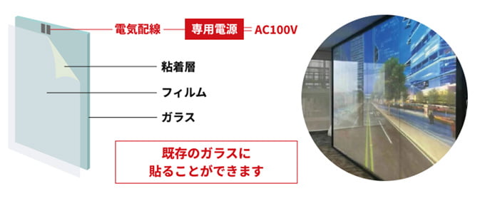 フィルムは通常不透明な状態ですが、電気を流すことで透明になります。消費電力は3.7whと非常に省エネ設計になっています。フィルム状になっているため、様々なシーンで既存のガラスに施工が可能です。