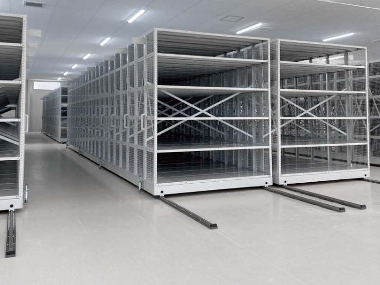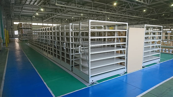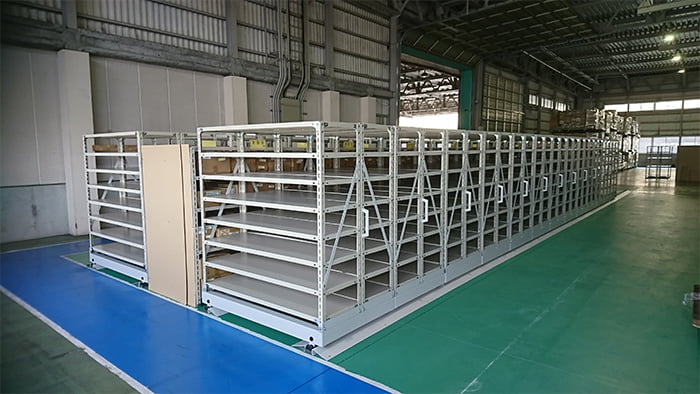 既存の棚をそのまま移動棚として使用することで低コストを実現。