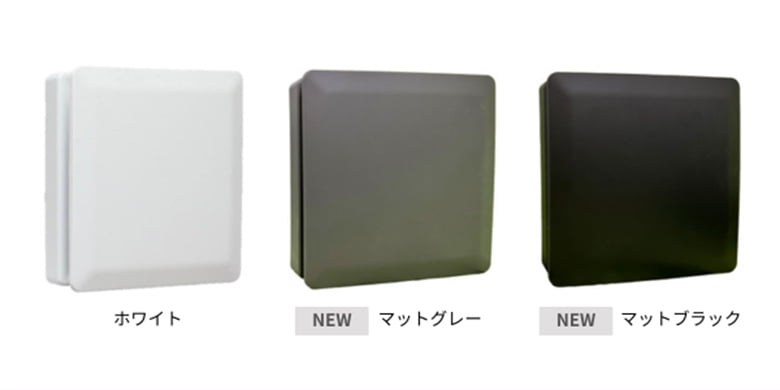 専用外気フードはシルバー、ホワイト、チョコレートブラウン、ブラックの4色(深型はシルバー、ホワイト、ブラックの3色)、室内側のパネルはホワイト、マットグレー、マットブラックの3色からそれぞれ選択可能。