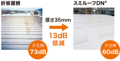 測定場所:某所工場内別建屋にて折板屋根とスミルーフDN®の騒音を測定。(天井より50cmの位置)