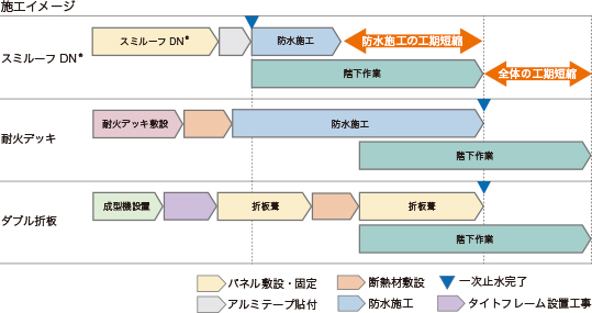 予めDNシートを被覆させたスミルーフDN®は、目地部を固定後にベルト状のDNシートを溶着するだけでこれまで同様の防水性を実現。またアルミテープ貼付後、階下作業を並行して行うことが可能であり、建設工事全体の工期短縮に大きく寄与します。