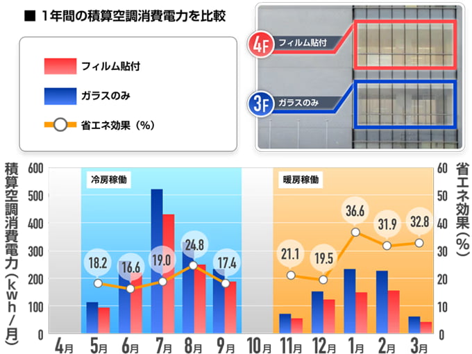リフレシャインを貼付することにより、夏は遮熱で涼しく、冬は断熱で暖かくなり、消費電力を削減します。ガラスのみの窓との比較実験で、年間23%の空調消費電力を削減!