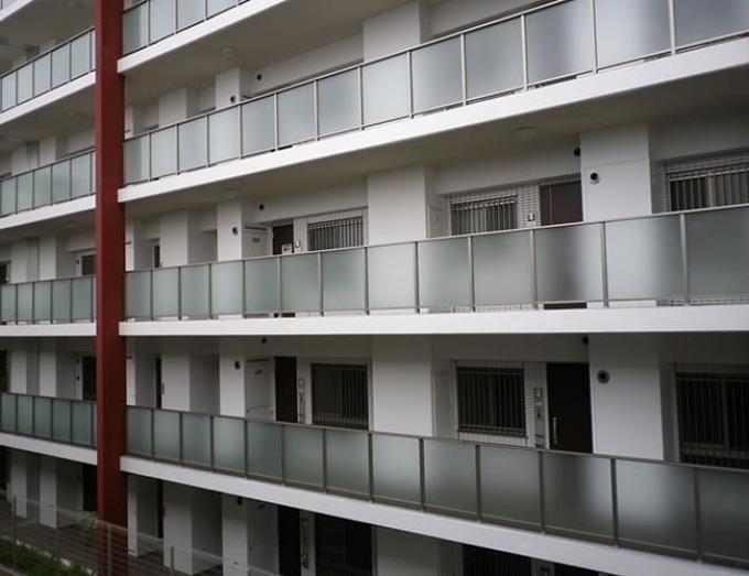 ■弊社標準品のパネル押さえ縁を無くし、ガラスを支柱内で固定させることにより、スリムな意匠を実現しました。