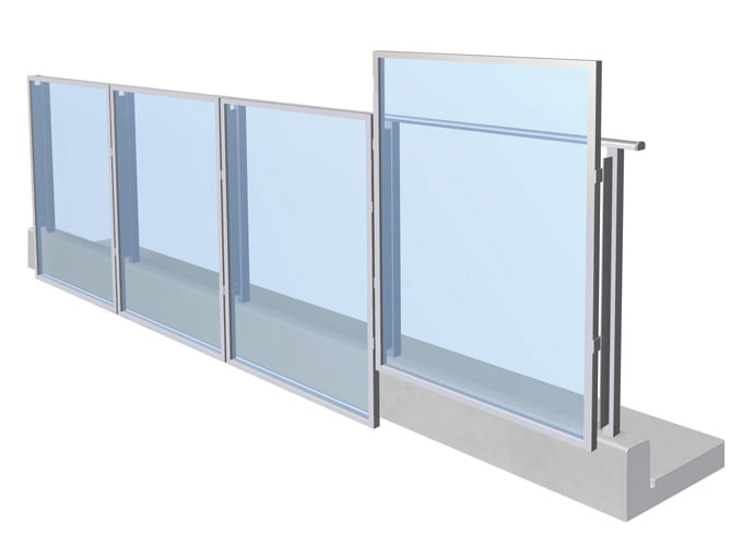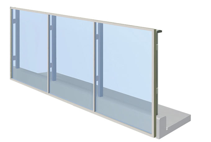 躯体パラペットを隠すスタイリッシュなデザインで、ガラスパネルの取り付け·交換作業時に外部足場が不要となるスライド構造を採用しました。
