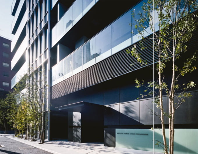 フラットレールのような連続ガラス面の意匠性を持ちながら、軽体(スラブ)をガラスパネルで隠すことで、建物全体がガラスで覆われたような美しい外観を演出します。