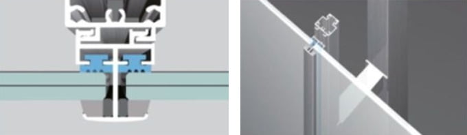 連続ガラスの取り付けはフラットレールと同様のケンドン式。スピーディーな施工で工期短縮に貢献します。