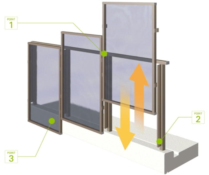 ガイドレールに沿ってパネル枠をスライドさせるので、躯体内側からの取り付け作業が可能です。