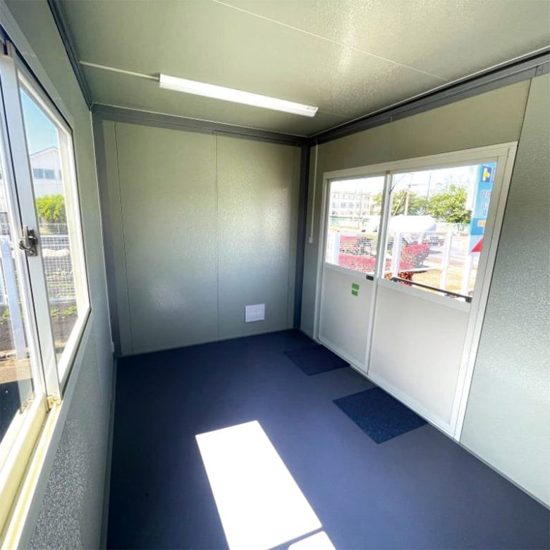 大きな窓からは日差しをたくさん取り入れられる開放的な空間のため休憩室や事務所、コンパクトな店舗を構えるのにも利用できるトレーラーハウスです。増築代わりに店舗や事務所のプラスαとして活用する方法も多いです!