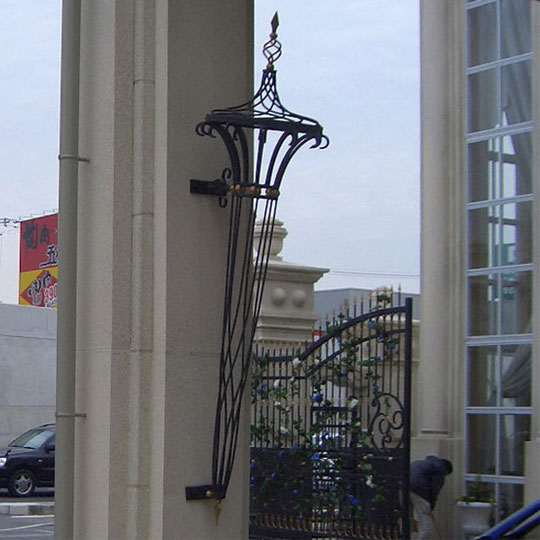 当社は仕上げにも工夫も凝らしました。ヨーロッパの伝統工芸であるロートアイアンを日本の風土に合わせる為に静電粉体塗装を施します。ショットプラストで付着物を除去し、亜鉛溶射で鉄を保護して静電粉体塗装を施します。これにより、艶の少ない仕上がりになり、よりアンティークに仕上げます。