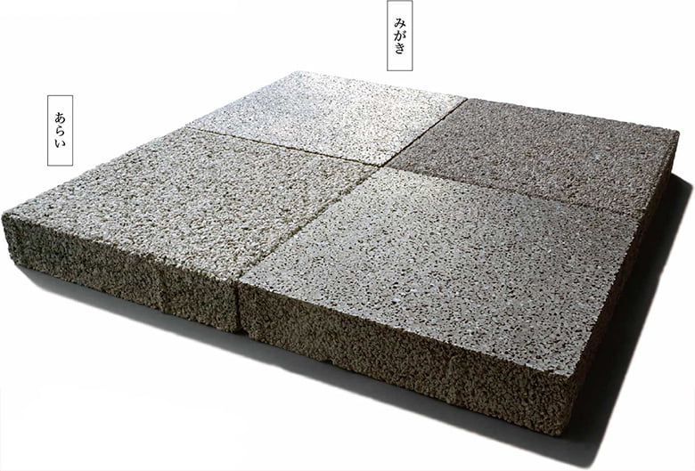 同じ種類の天然石に 2 種の異なる仕上げ(肌質)を施したブロックです。天然石による表面テクスチャーの違いが舗装の繊細な変化を楽しめます。