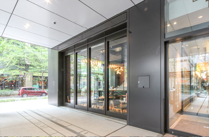 一見したら嘗通の自動ドアのエントランス。しかし、必要時には自動ドアユニットそのものも移動し、フルオープンにできます。自動ドアは、一般の仕様と同様の補器〔センサー等)が付いていますので安心です。