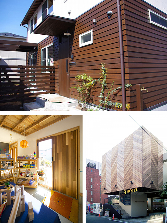 荷重を少なくできるので、カーポート上のデッキや屋上緑化に使用する木材としても最適。のこ、かんな、サンダーなど、いずれの加工でも美しく仕上がり、釘打ちも容易。