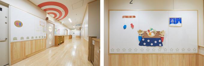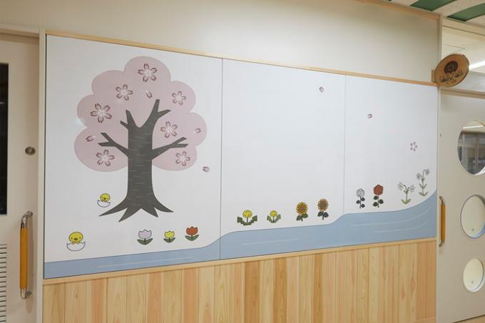 廊下壁面に設置されたホーローパネルは、園児が自由にお絵かき出来るように、モノトーンで仕上げています。入園式や卒園式、お誕生日会等のイベント時には、マグネットで手早く装飾が出来て、大変便利に使えます。
