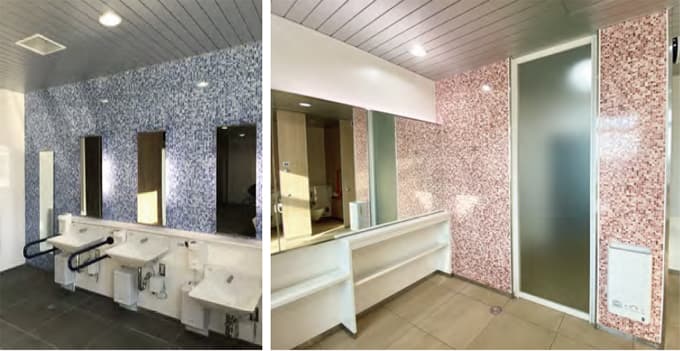 目地の汚れを気にしたくないときには、ホーローのタイル柄はいかがですか?男女別を認識しやすくするブルーとピンクの他に、焼き物ならではの温かみあるさまざまな発色に対応できます。