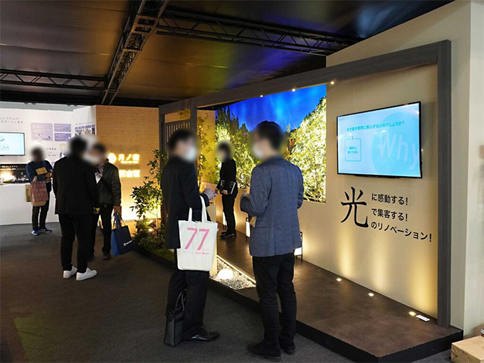 ホテルや旅館では非日常感を味わえる特別な時間をお過ごしになるお客様がご利用されます。料理や入浴、睡眠など様々なシチュエーションで光演出はくつろぎやリラックスを与えてくれる大事な役割も担っています。新規開業やリニューアルなどをお考え中の方は、ぜひタカショーデジテックのブースまでお気軽に足をお運びくださいませ。