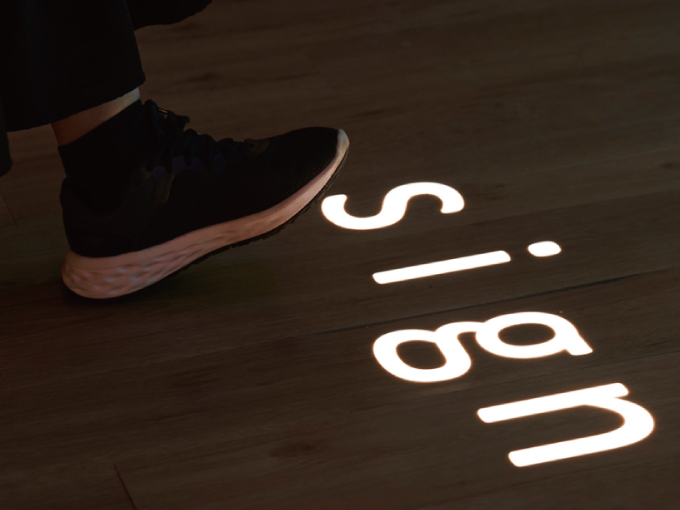 商業施設の床面に設置できるアクリル面発光文字サイン。人が歩いても問題のない耐久性です。