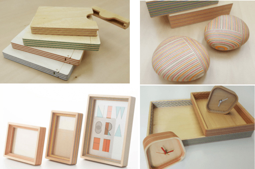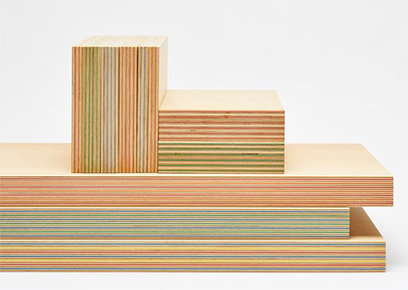 色のついた再生紙を北海道産の木単板の間に挟みこんで生まれた新しい合板です。