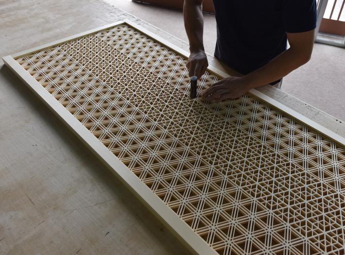 伝統木工技術「組子(組子細工)」とは、釘を使わずに木を幾何学的な文様に組み付ける木工技術のことをいいます。 細くひき割った木に溝・穴・ホゾ加工を施しカンナやノコギリ、ノミ等で調節しながら1本1本組付けする繊細な技術です。