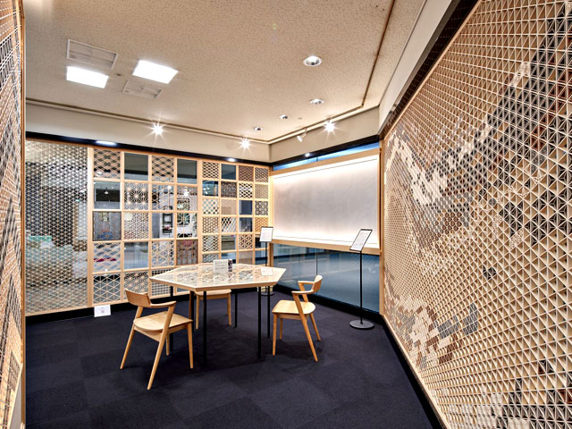 大阪ギャラリーは、タニハタ組子文様18種(規格マス目、大柄タイプ)全種を展示してあり、木の質感やマス目の大きさなどご確認いただけます。