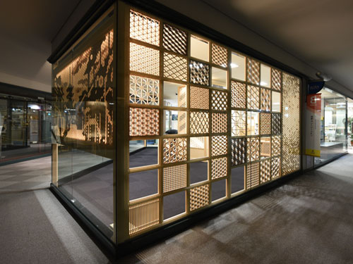 向かって右側の通路をまっすぐ進んでいただきますと左側にタニハタの組子が現れます。