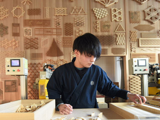 タニハタ本社工場で、見学および組子の製作体験ができます。職人が対応するため、事前予約が必要です。
