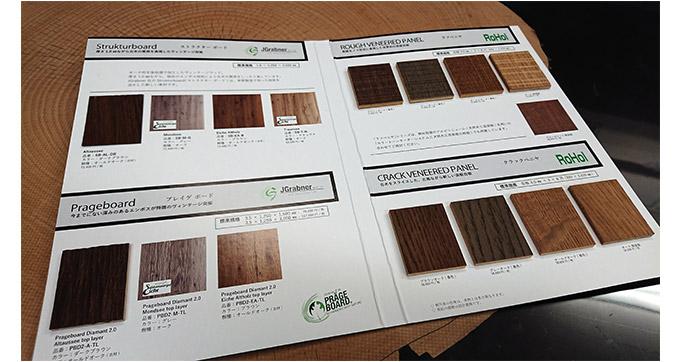 オーク材を用いた、独特なエンボスが特徴の「ストラクターボード」「プレイゲボード」の他、「ラフベニヤ」「クラックベニヤ」の各サンプルもこの1冊でご確認いただけます。