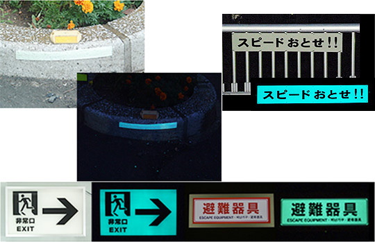 高輝度・長残光のグローペイントで印刷された看板は、暗い道路で注意を喚起させ自転車と人の接触事故等を回避するために設置されました。減灯・消灯の省エネ対策にも対応した看板です。