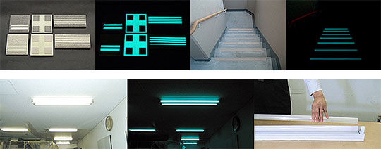 他にも、足元が光る避難誘導に有効な蓄光タイルは長残光のブルー発光で、焼成仕上げなので火災時でも不燃・有害ガスを出しません。