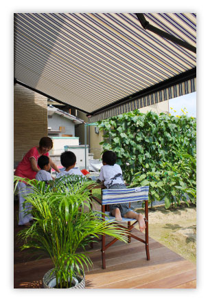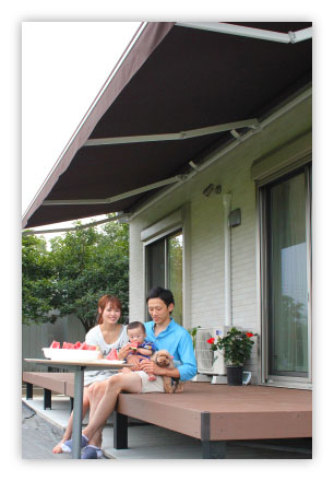 オーニングの張り出しの長さや角度を変えることにより、日差しだけでなく、高所からの視線もシャットアウト。プライバシーを守ることができます。