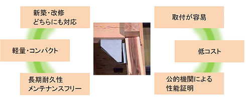 仕口ダンパーは、木造建物の柱と梁の交点(仕口/しぐち)に取付ける制振装置です。地震による建物の揺れのエネルギーをしなやかに吸収し、建物の変形を小さくすることで地震による被害、揺れを抑えます。