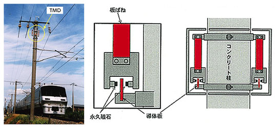構造物の振動エネルギーを永久磁石と導体板との相対運動により生じる渦電流に変換し、熱として消散させることで制振するダンパーです。使用されている磁石は、半永久的に効果を発揮します。