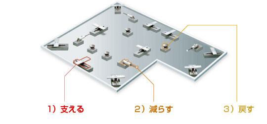 ■THK免震システムの仕組み免震構造には「支える」「減らす」「戻す」の3つの機能が求められます。THK免震システムは機能別に専用の装置を用意しておりますので、設計の自由度が高く、様々な建物に対応することが可能です。